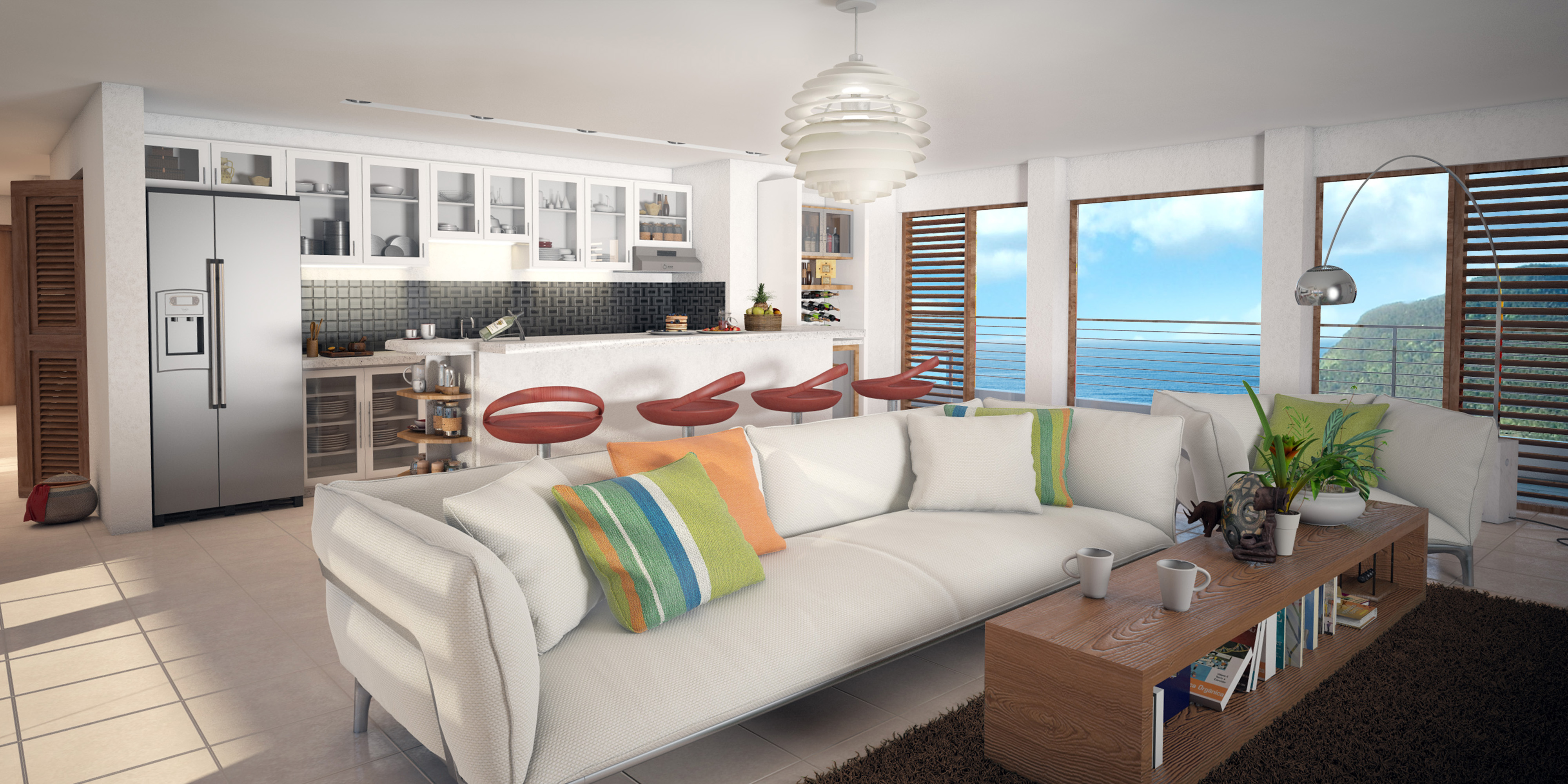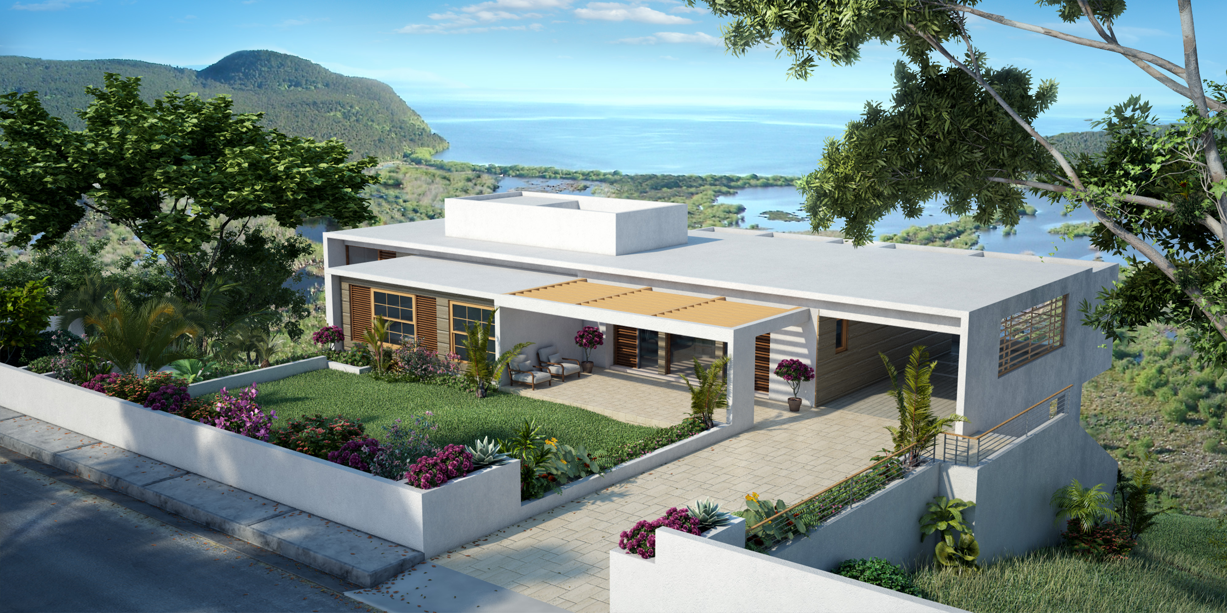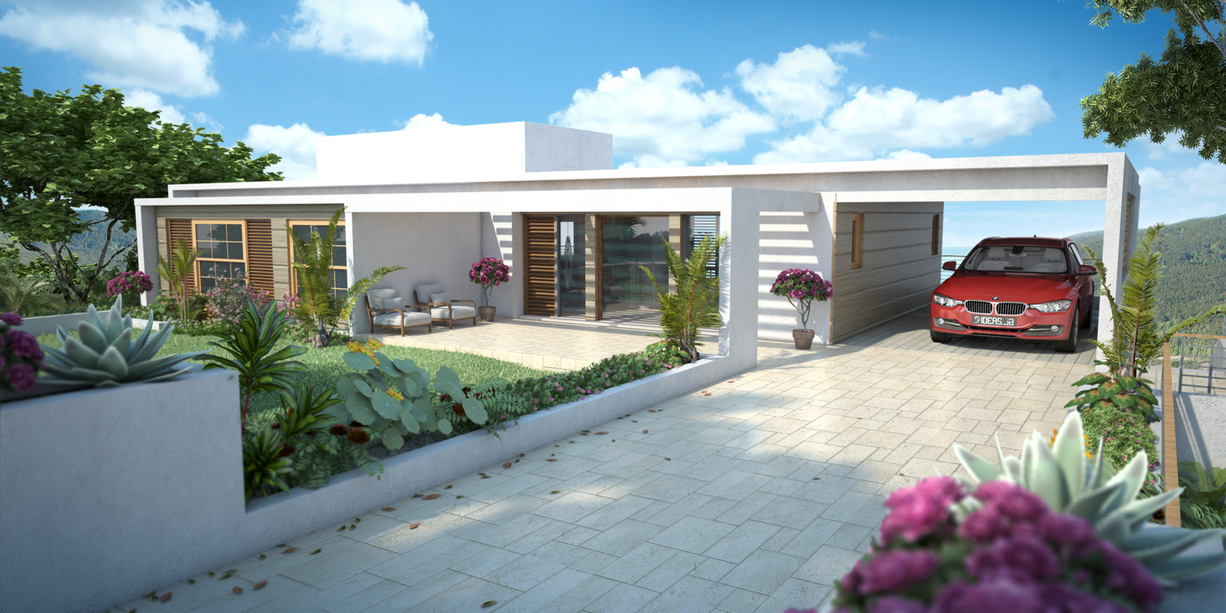 The Soares Residence is located in the north coast parish of Portland, Jamaica, overlooking the clear waters of the Caribbean Sea. The house is designed as a modern tropical home that is responsive to our Caribbean Climate with deep overhangs which shade exterior walls and with a transparent design, which allows for excellent cross ventilation while maintaining strong vertical and horizontal lines for a modern feel. The house contours to the sloped hill which it sits on with a split level to the rear of the house with a private studio space below and with a viewing deck which cantilevers out above capturing the experience of being on the seas.